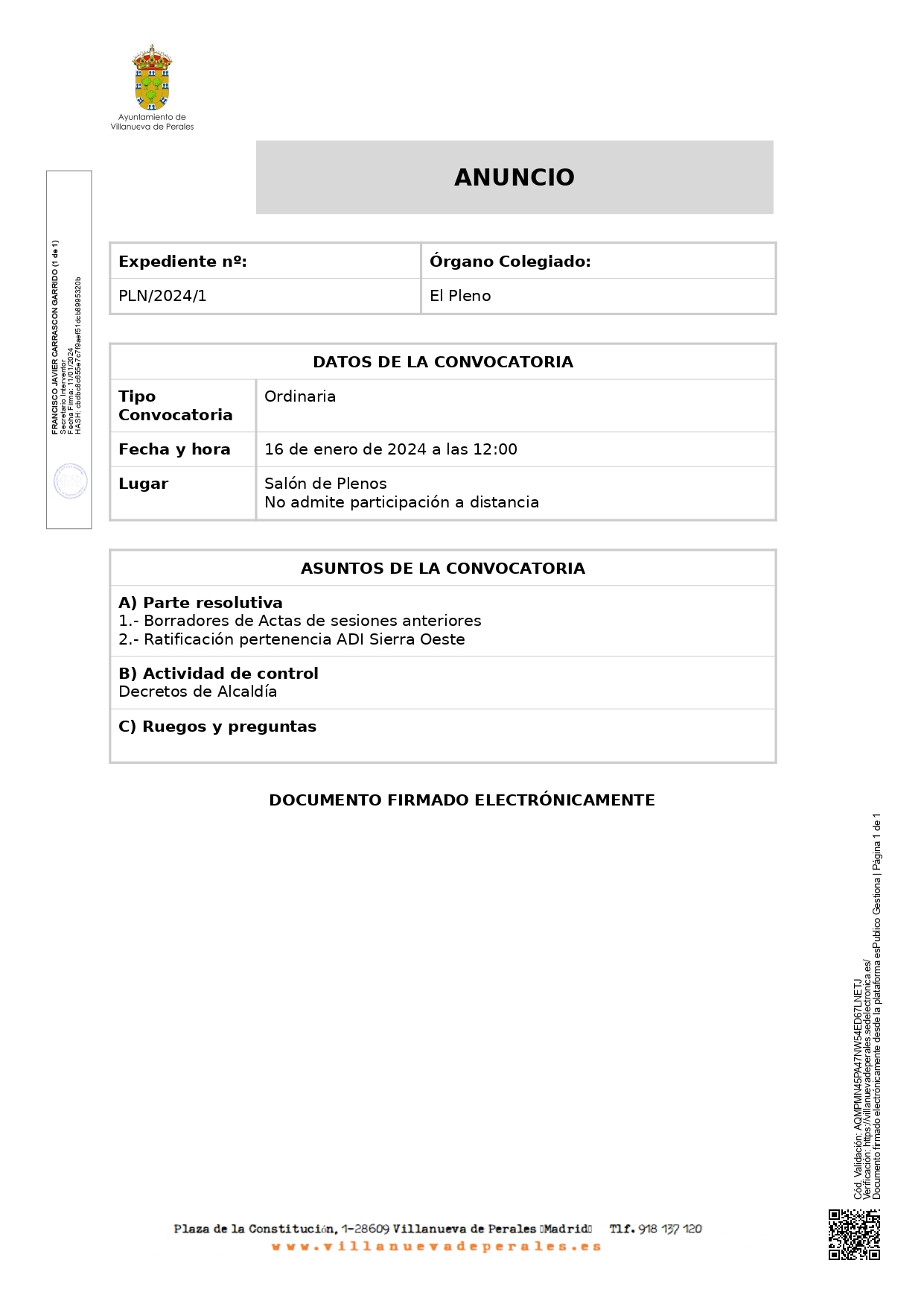 Convocatoria Pleno ordinario 1 abril 2024 12.00 horas