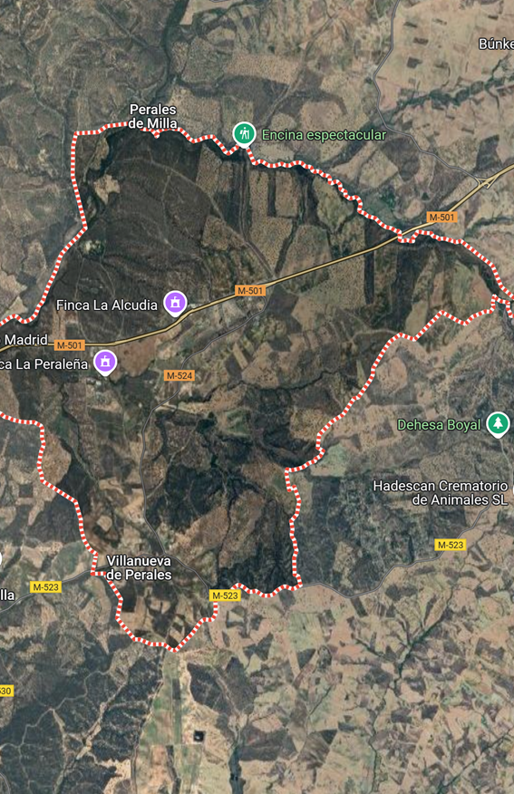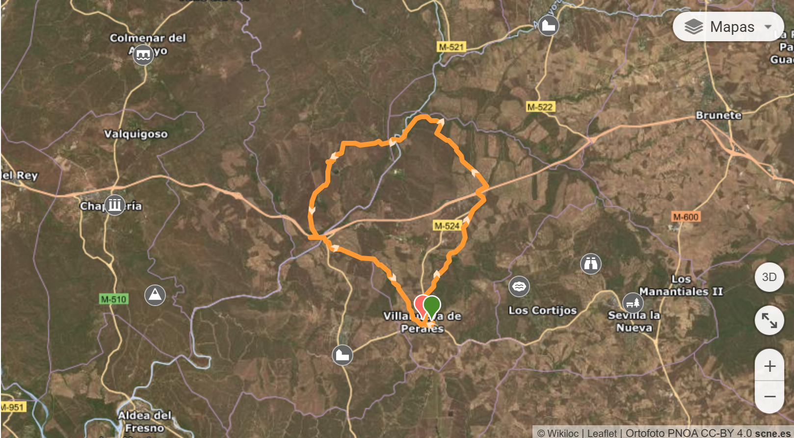 Esta ruta sale de Villanueva de Perales por la Cañada Real Segoviana, hacia el norte, y llega a las Casas de la Encrucijada, en la carretera M-501. Su segundo tramo nos conducirá desde las Casas de la Encrucijada, hasta Sevilla la Nueva, siguiendo el Camino de Perales que transcurre por magníficas dehesas, con preciosas vistas a la sierra de Guadarrama.